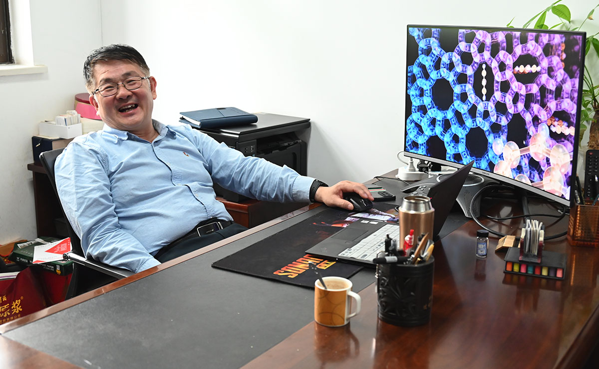 In a follow up study in 2022, Wei Fei’s team used a benzene molecule (yellow and lilac) as a probe to better understand the structural flexibility of zeolite catalyst ZSM-5’s pores (the blue and purple represent ZSM-5’s crystal structure, with the black circles representing the pores).