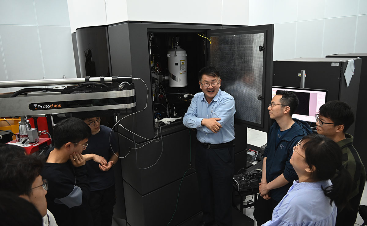 Advances to integrated differential phase contrast scanning transmission electron microscopy (iDPC-STEM) has made imaging the van der Waals forces pointers possible, says Wei Fei. Here Wei Fei (centre) and his team at Tsinghua’s Department of Chemical Engineering stand next to their iDPC-STEM.