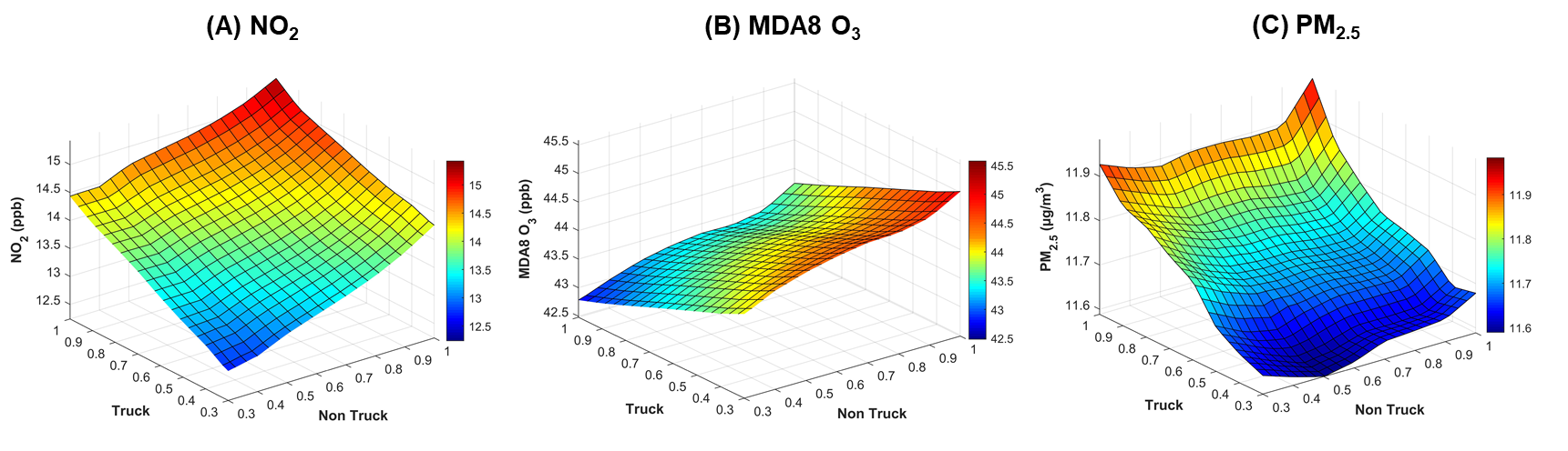 Figure 3. Predicted annual-average concentrations. Distribution of (A) NO2, (B) MDA8 O3, and (C) PM2.5 with different combinations of non-truck and truck activity fractional changes relative to the annual average level of 2019.