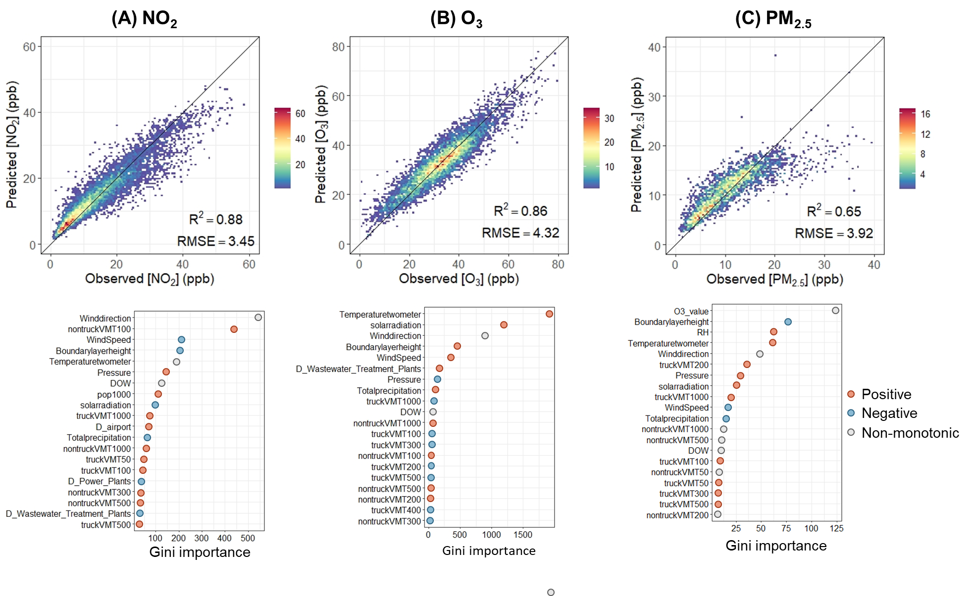 Figure 1. Model performance and variable importance for three species. (A) NO2, (B) O3, and (C) PM2.5 in Los Angeles. Cross-validated model R2 and root mean squared error (RMSE) are calculated by using a 5-fold cross-validation modeling performance for 24-h average concentrations. The color indicates the sample size for each dot. The variables are listed in order of importance from top to bottom. The horizontal axis represents the Gini index from the Random Forest model. A larger value represents higher importance.