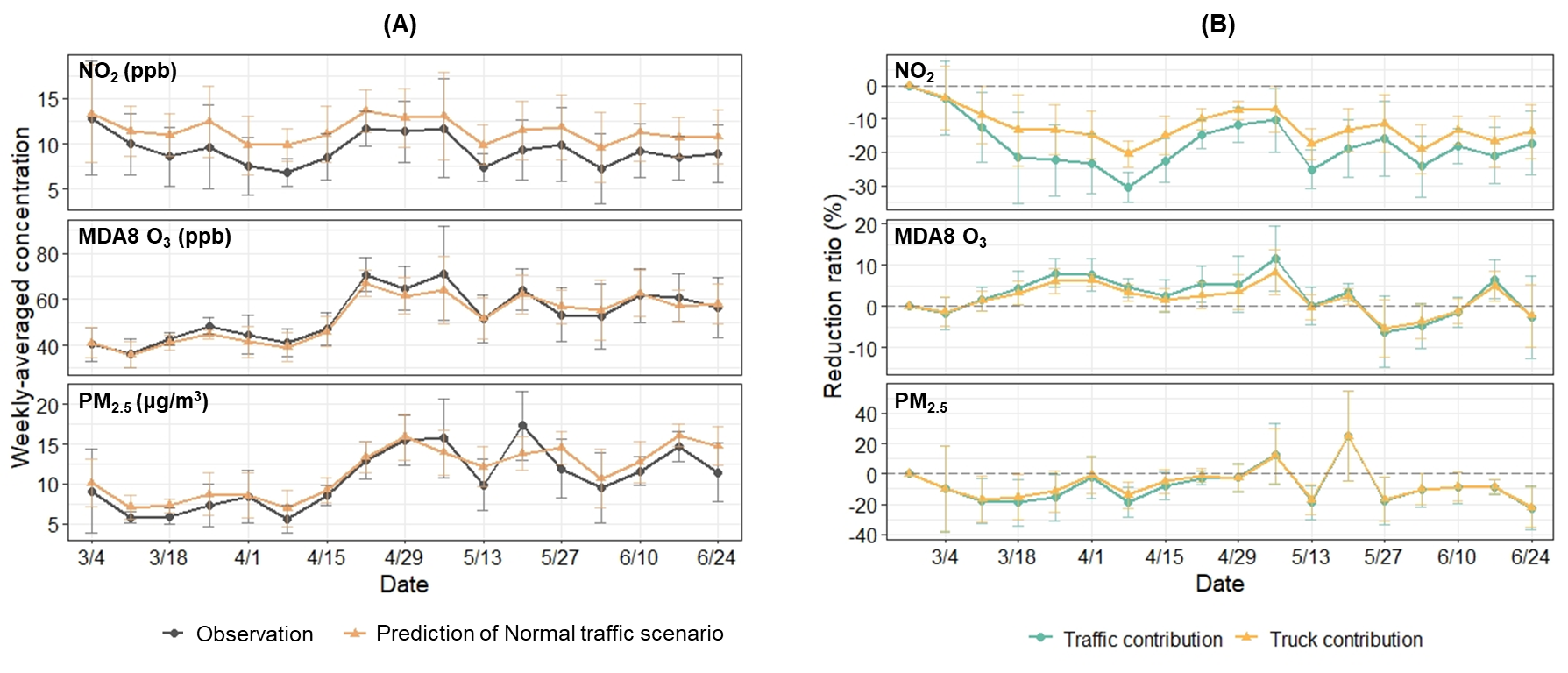 Figure 2. Comparison of observations and predictions. (A) Comparison of observations and predictions of normal traffic scenario and (B) the impact of traffic reduction from total fleet and truck fleet on NO2, O3, and PM2.5 concentrations during the lockdown period of the COVID-19 pandemic in Los Angeles. Each data point represents a weekly mean. The error bars are standard deviations from daily results in each week.